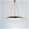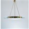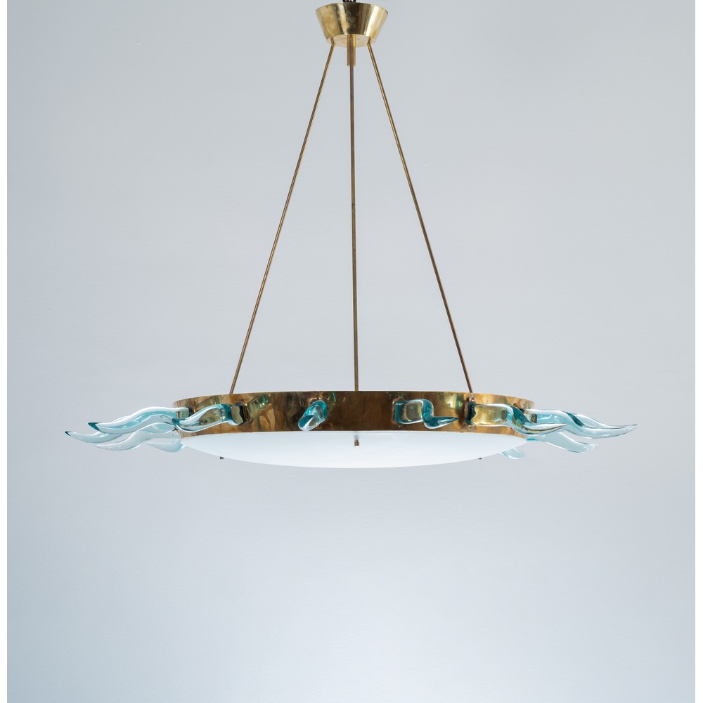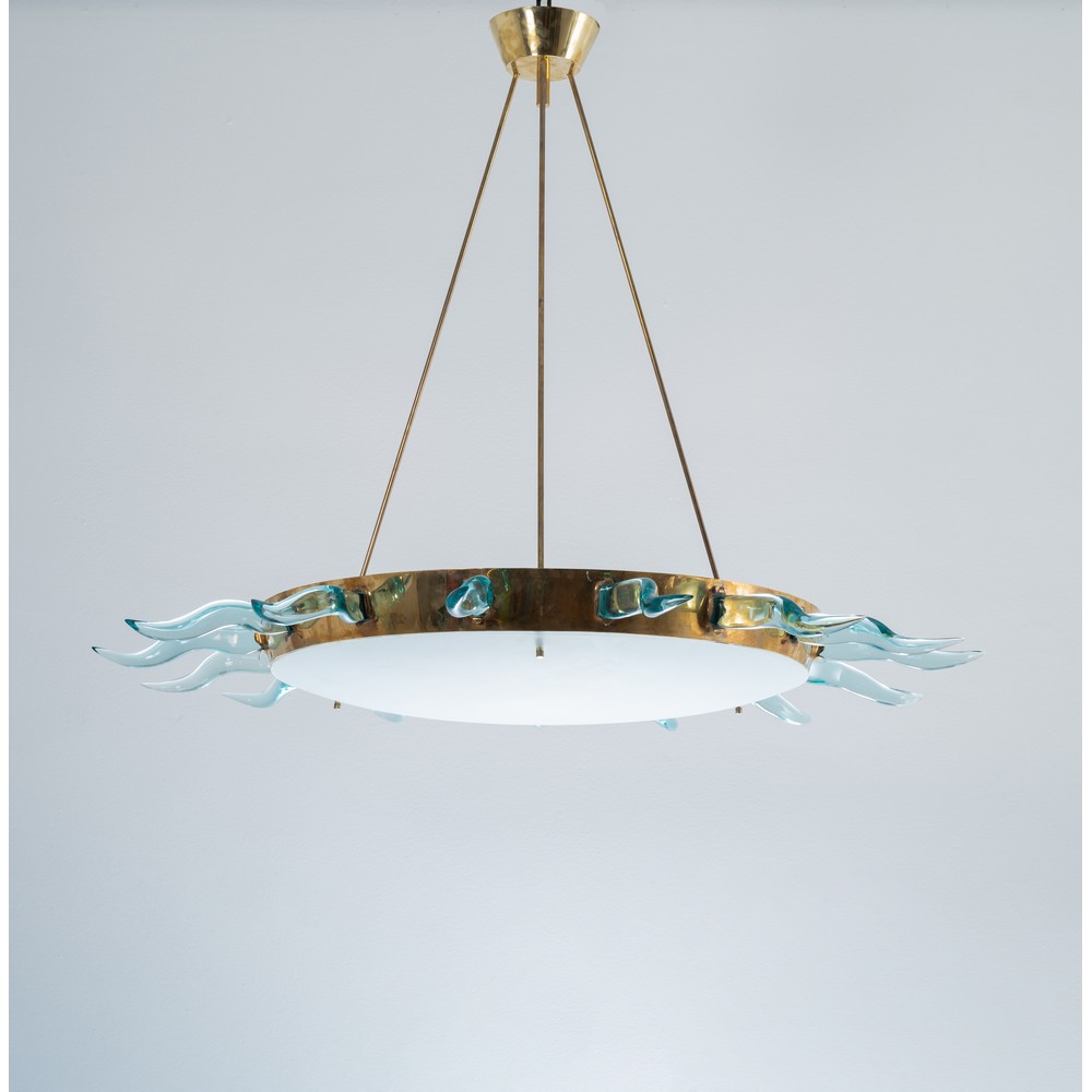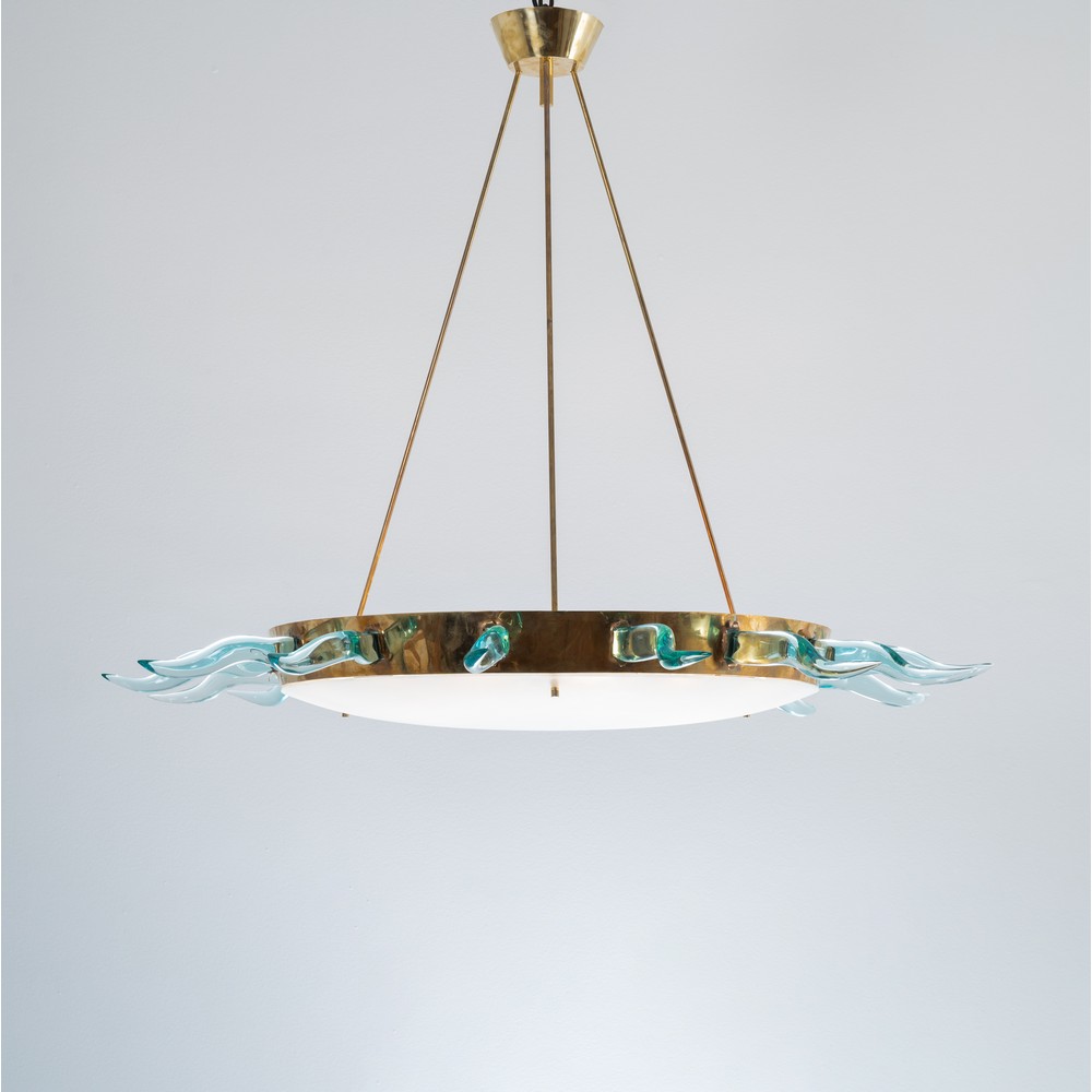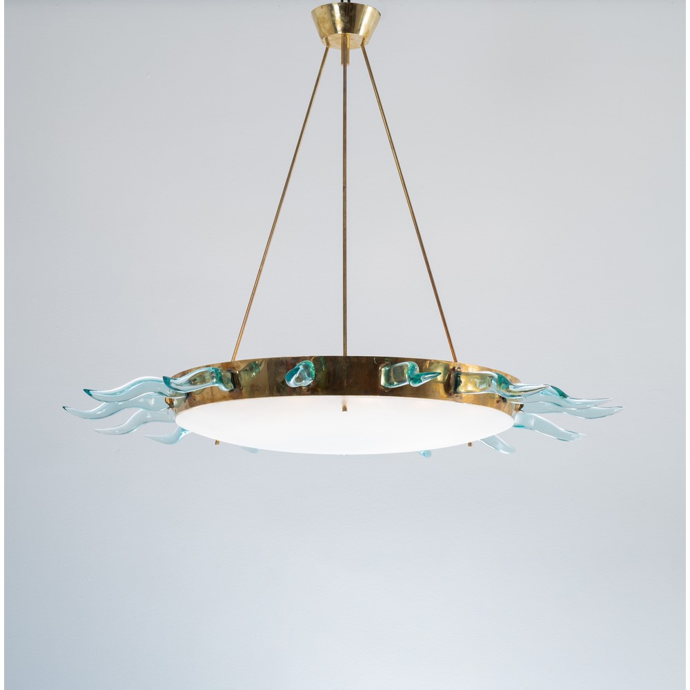 Rara e unica lampada a sospensione a trenta luci, struttura in ottone, diffusore circolare in vetro opalino lattimo, decori in cristallo ondulato di grosso spessore verde Nilo, molato e sagomato a mano. Pezzo unico.