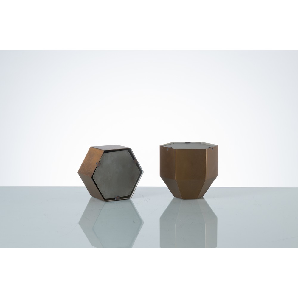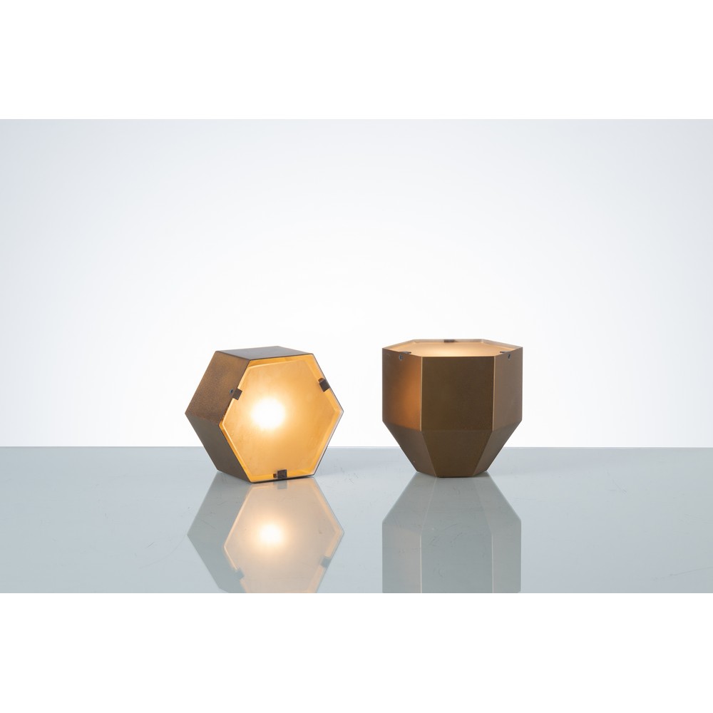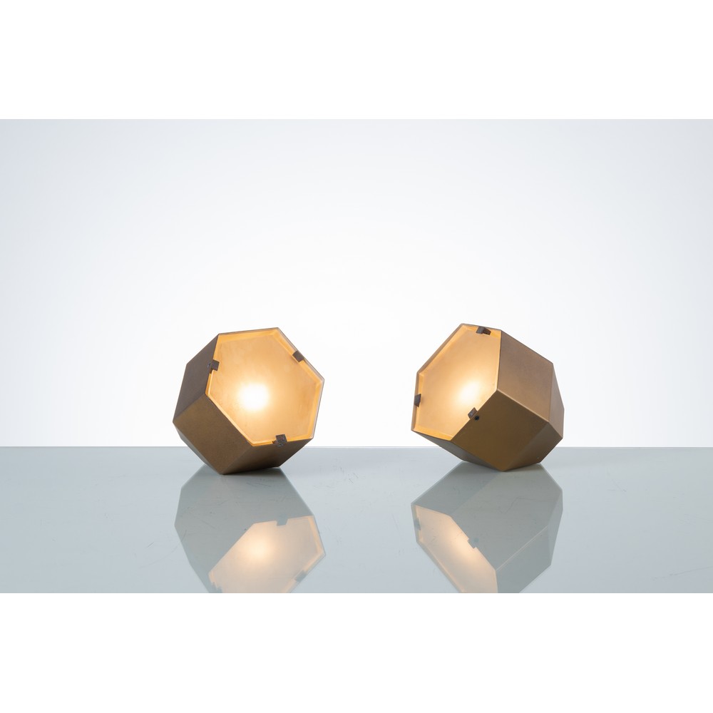 Coppia di lampade da tavolo ad una luce modello “2202”, struttura esagonale in ottone con diffusore in vetro satinato.
