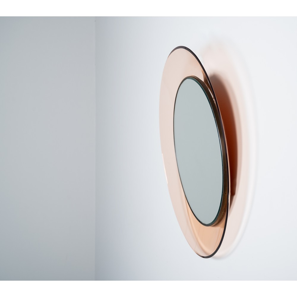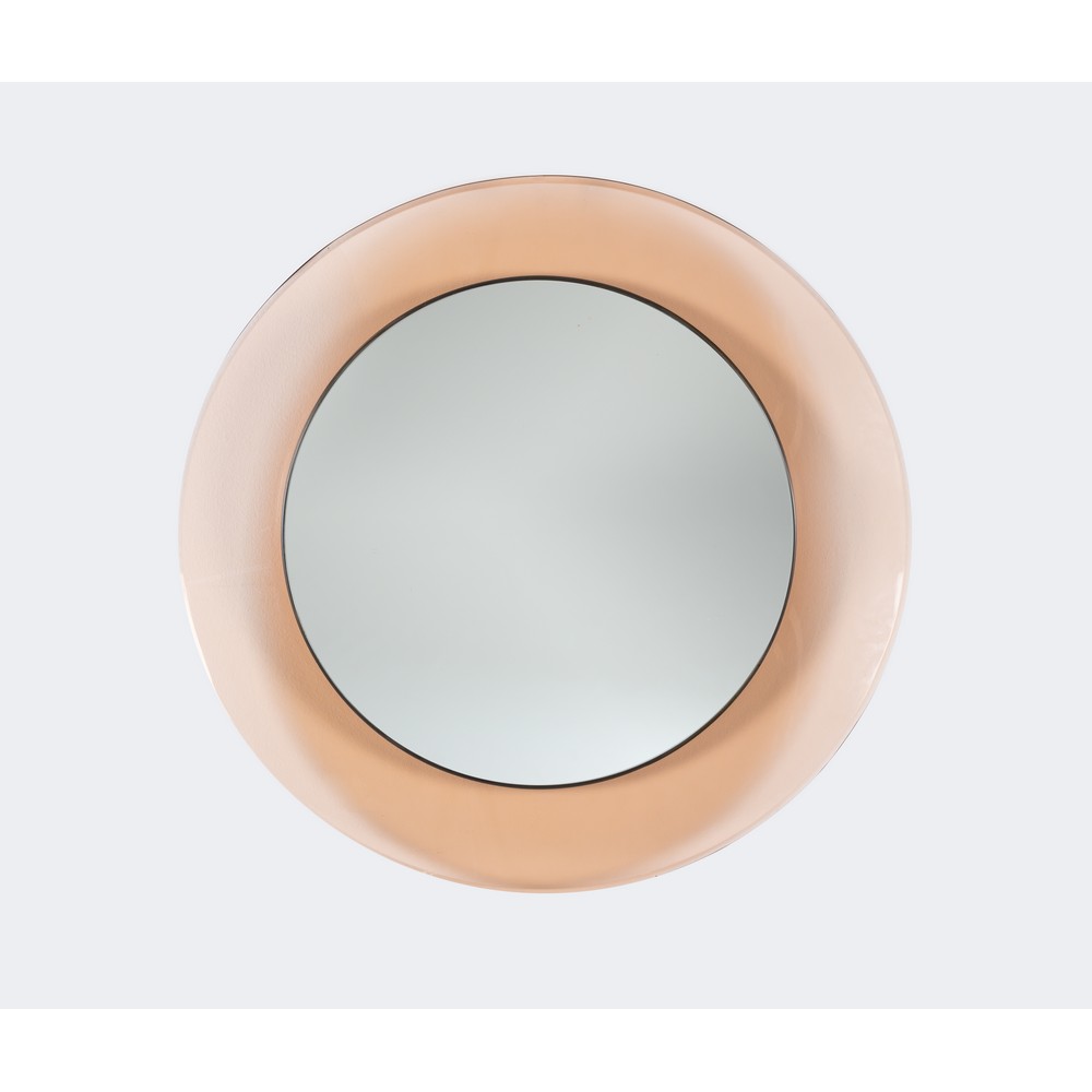Specchio da parete circolare modello “1669” con cornice in cristallo colorato rosa, curvato e molato, montatura in ottone lucidato e zapponato.