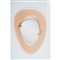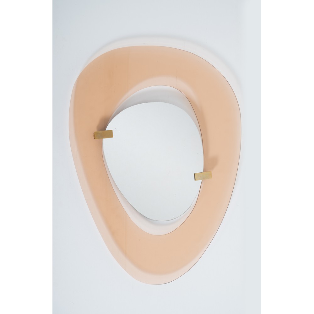 Specchio da parete asimmetrico con cornice in cristallo rosato, cristallo specchiato, giunti in ottone, legno. Etichetta di produzione.