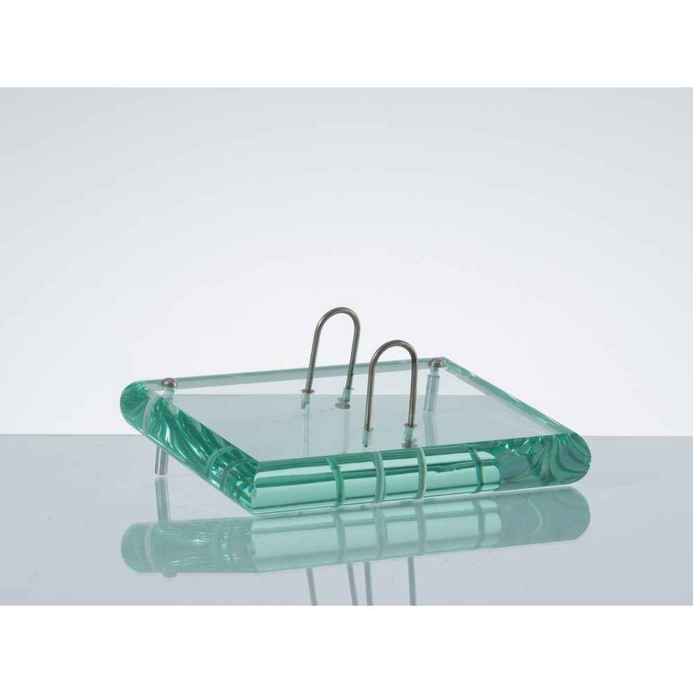 Sparti carte da scrivania in cristallo si grosso spessore verde Nilo, corpo rettangolare con bordo molato, sostegni in metallo cromato. Sbeccatture.