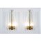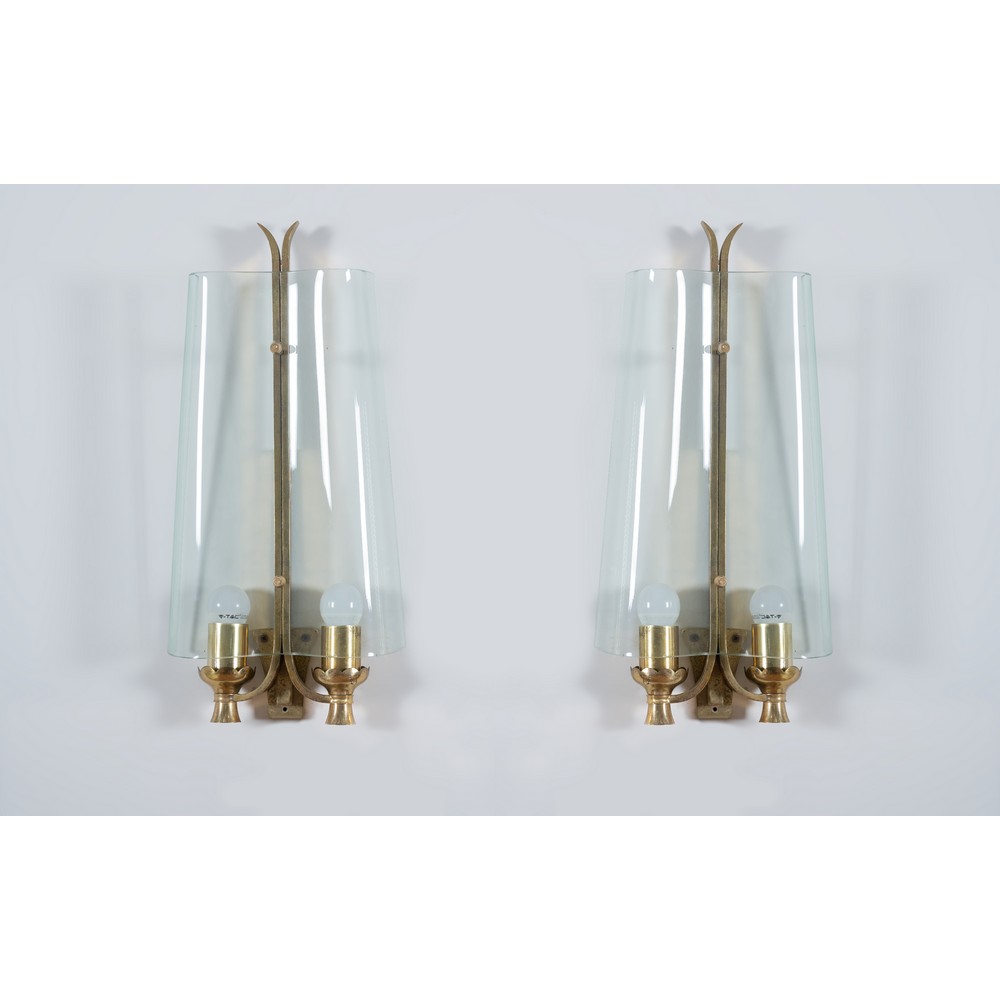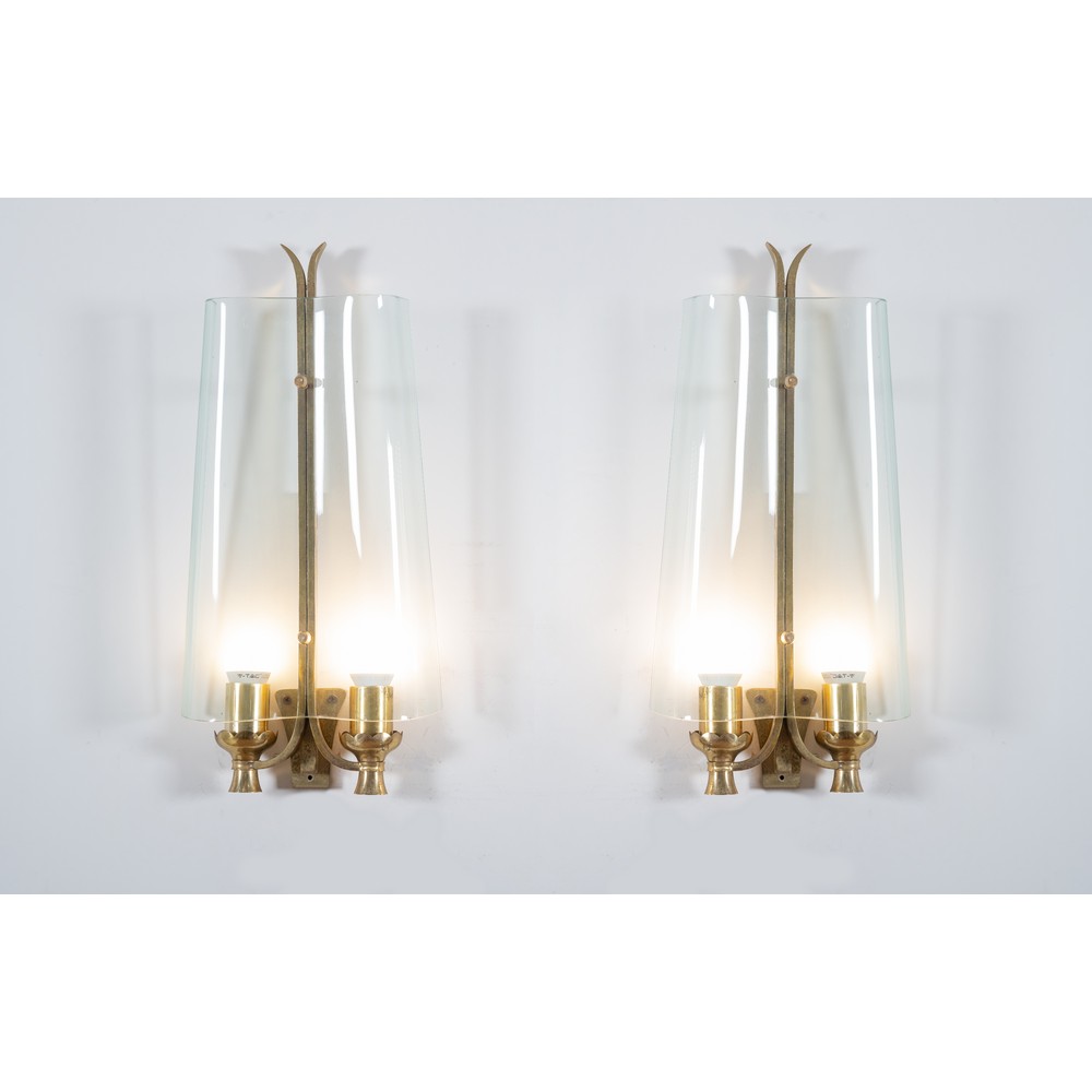 Coppia di lampade da parete a due luci, struttura in ottone con diffusore in cristallo curvato.