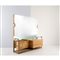 Raro mobile con struttura in ottone, sul fronte a destra due cassetti in legno decorati con bugne e maniglia aggettante, a sinistra un vano a giorno in legno di acero decorato con tarsie di legni misti raffigurante una scena romantica con colombi, nastri, cornucopia e fiori, piano rettangolare in cristallo trasparente di grosso spessore. Sulla parte superiore uno specchio con cornice in ottone e cristallo specchiato.