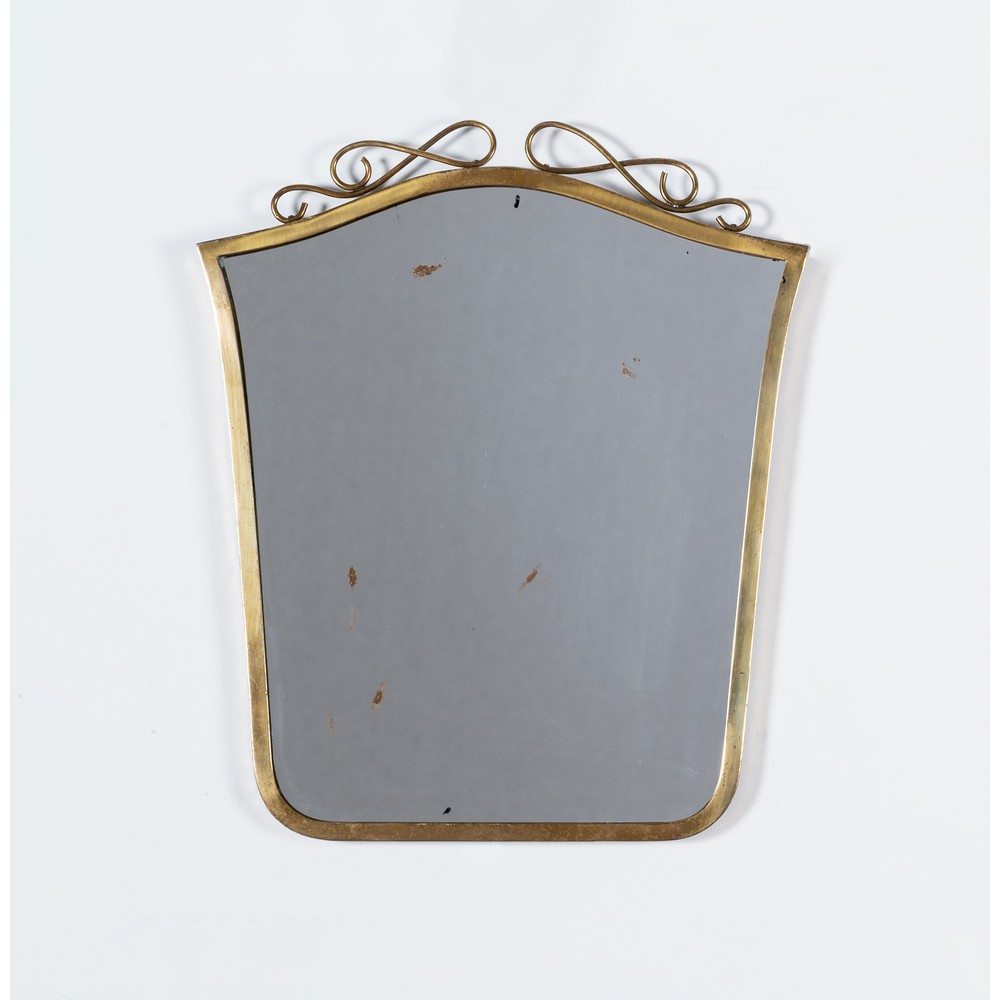 Specchio da parete sagomato, cristallo specchiato, cornice in ottone decorata con fregio tubolare.