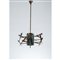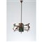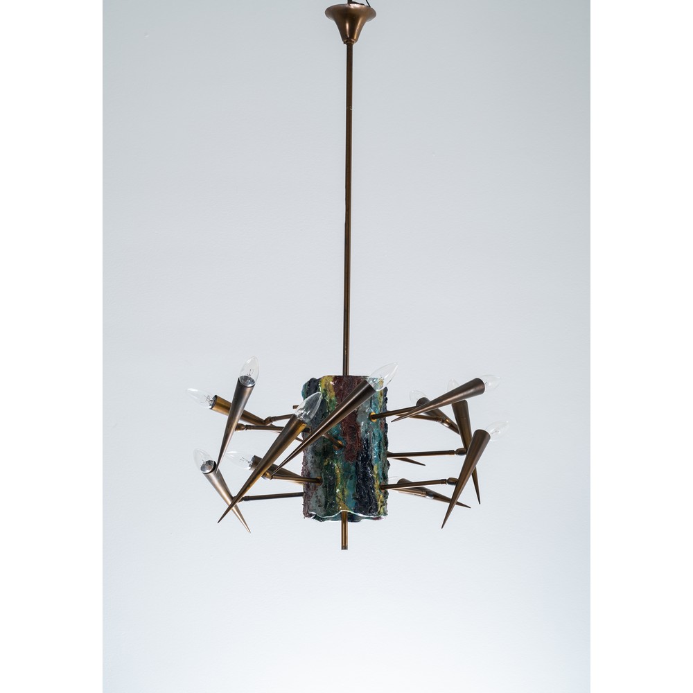 Lampada a sospensione a undici luci modello “4013”, struttura in ottone, corpo centrale in ceramica smaltata e decorata in policromia con astrazioni, diffusori conici in ottone.