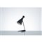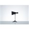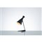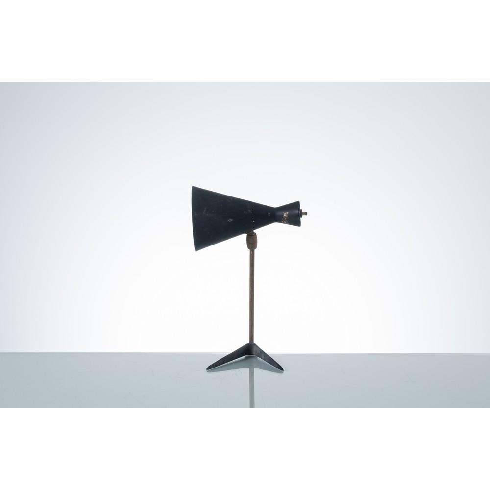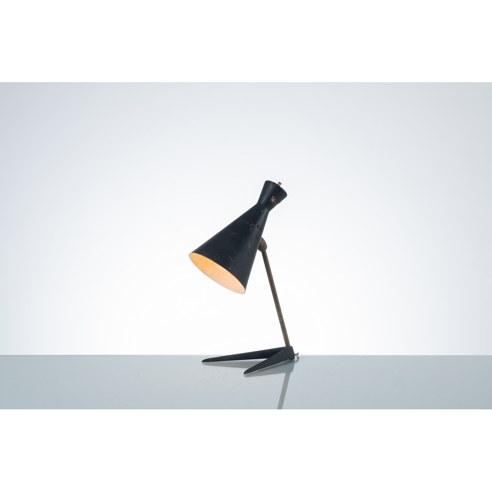 Lampada da tavolo ad una luce, struttura in ottone e metallo verniciato nero, diffusore biconico in metallo verniciato bianco e nero, piede a coda di rondine. Segni di uso.