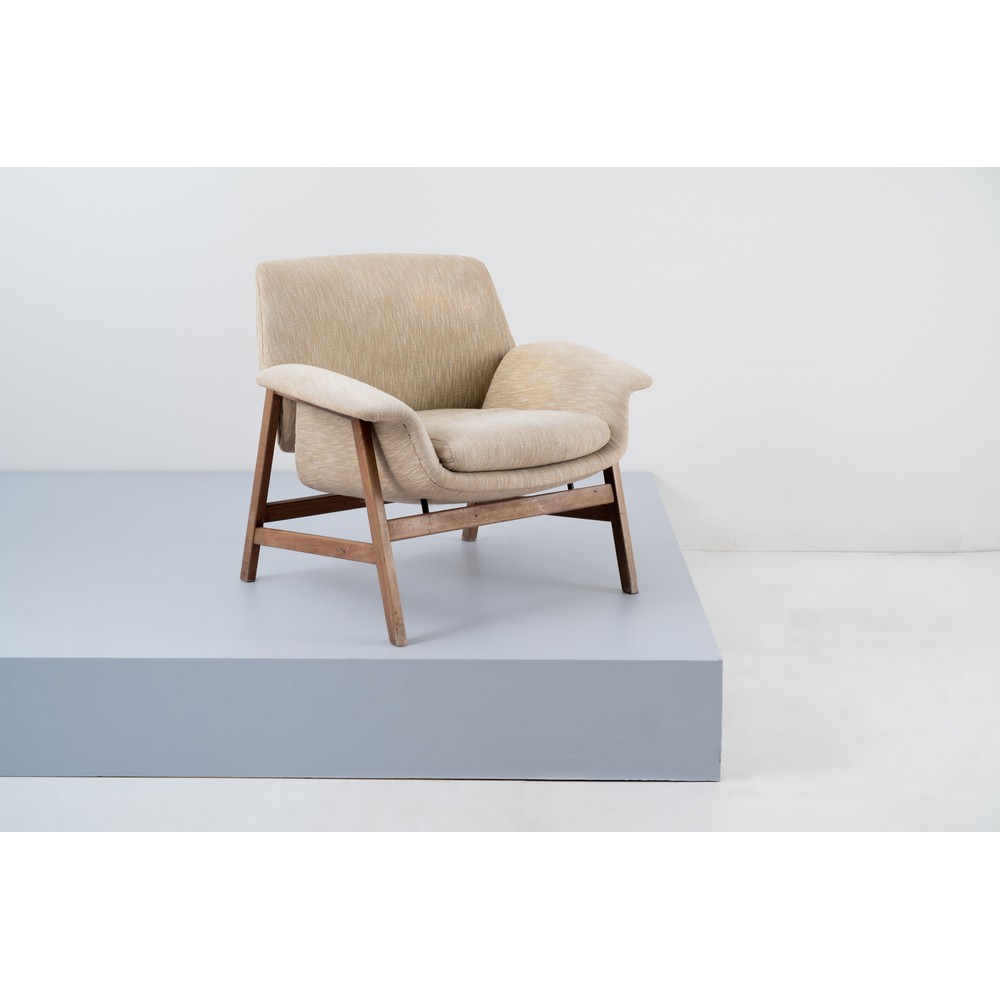 Poltrona modello “849” con struttura in legno, imbottitura e rivestimento in tessuto beige,segnalazione al Compasso d’Oro del 1956.