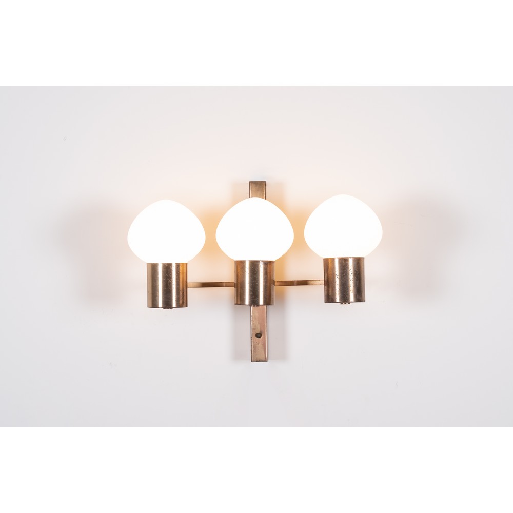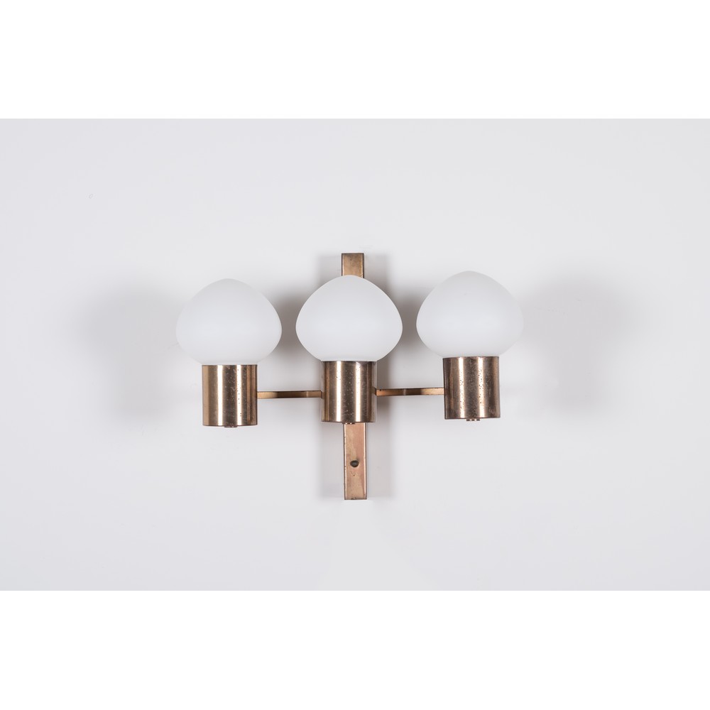 Lampada da parete a tre luci, struttura in ottone con diffusore a goccia in vetro opalino lattimo.