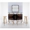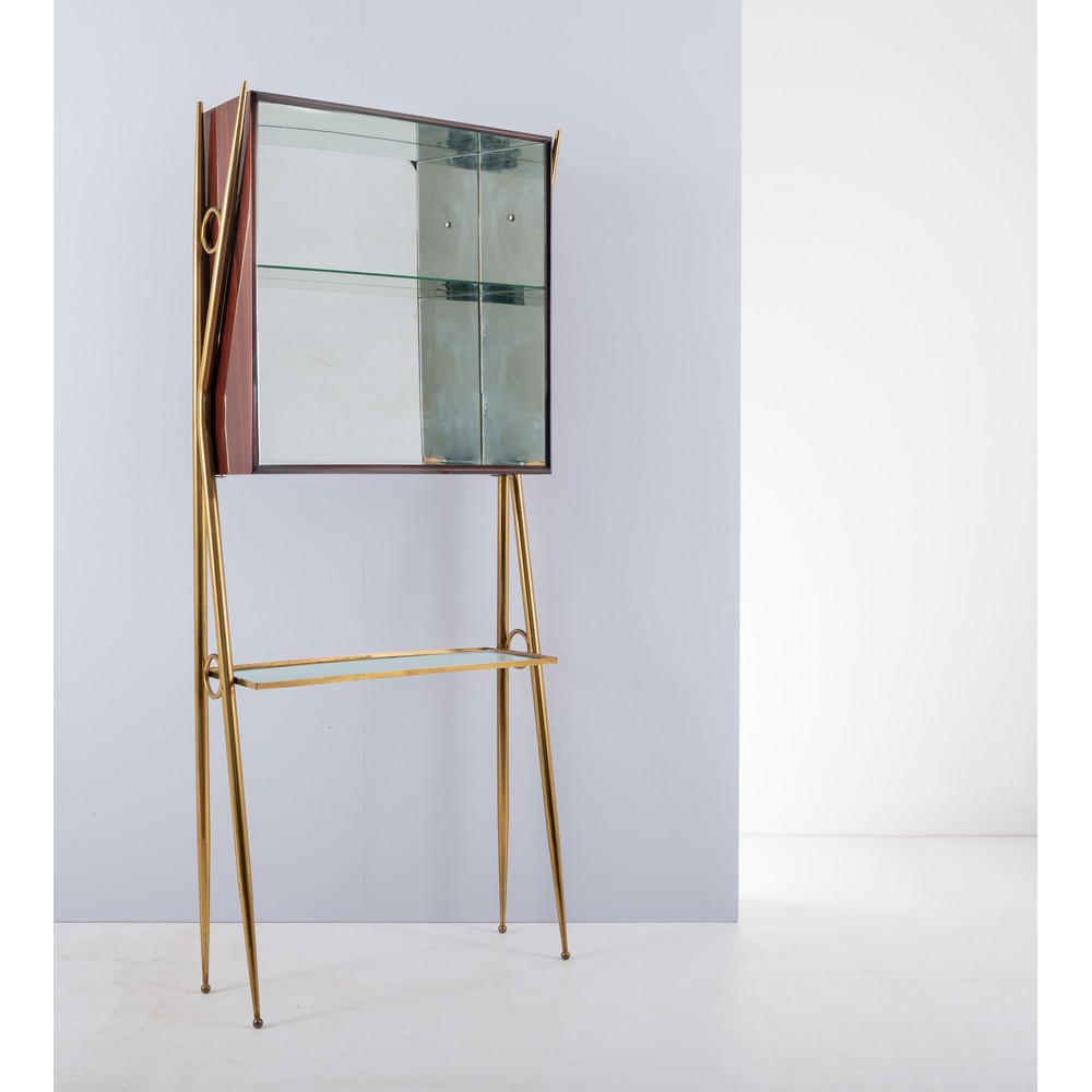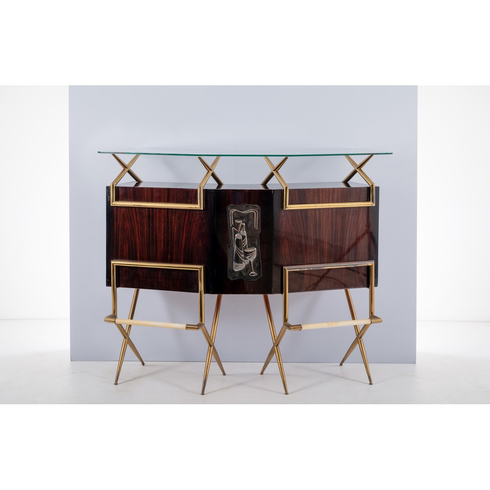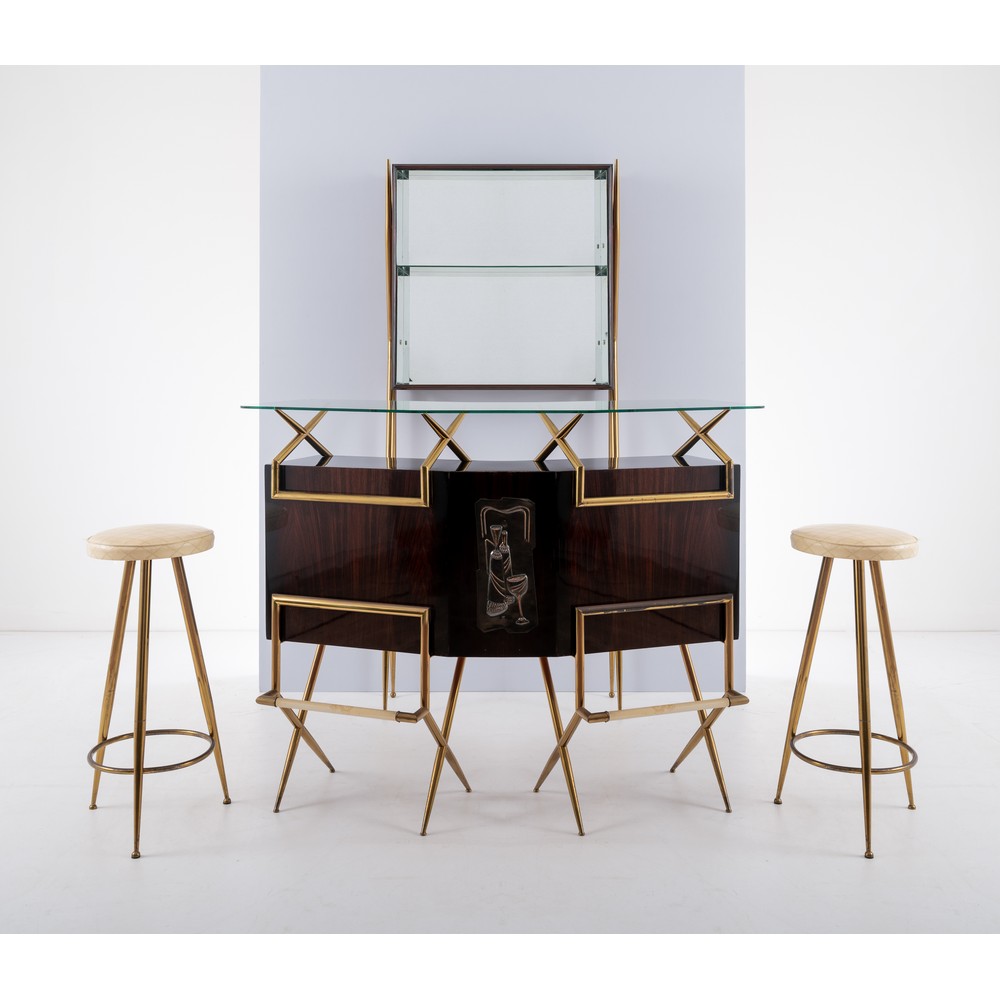 Arredo bar composto da un banco in legno esotico decorato nella parte centrale, struttura in tubolare di ottone, corpo sagomato con piano in vetro, vani contenitori; un mobile retro banco con struttura in tubolare di ottone, vano a giorno sospeso in legno esotico, cristallo specchiato, mensola in vetro; due sgabelli alti con piedi a spillo in ottone e seduta circolare in skai avorio. Lievi difetti, ossidazioni, piccola rottura al cristallo specchiato all'interno del mobile retro bar.