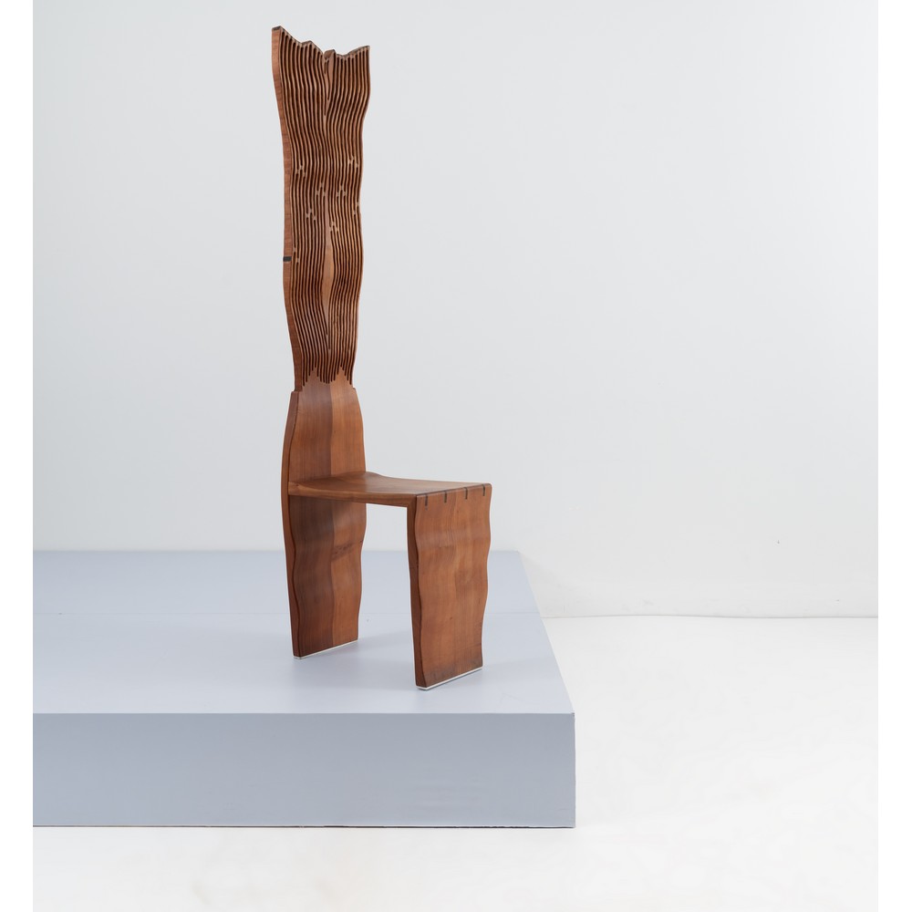 Sedia modello “Seggiotropica” in legno di ulivo massello interamente lavorato a mano con alto schienale.