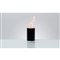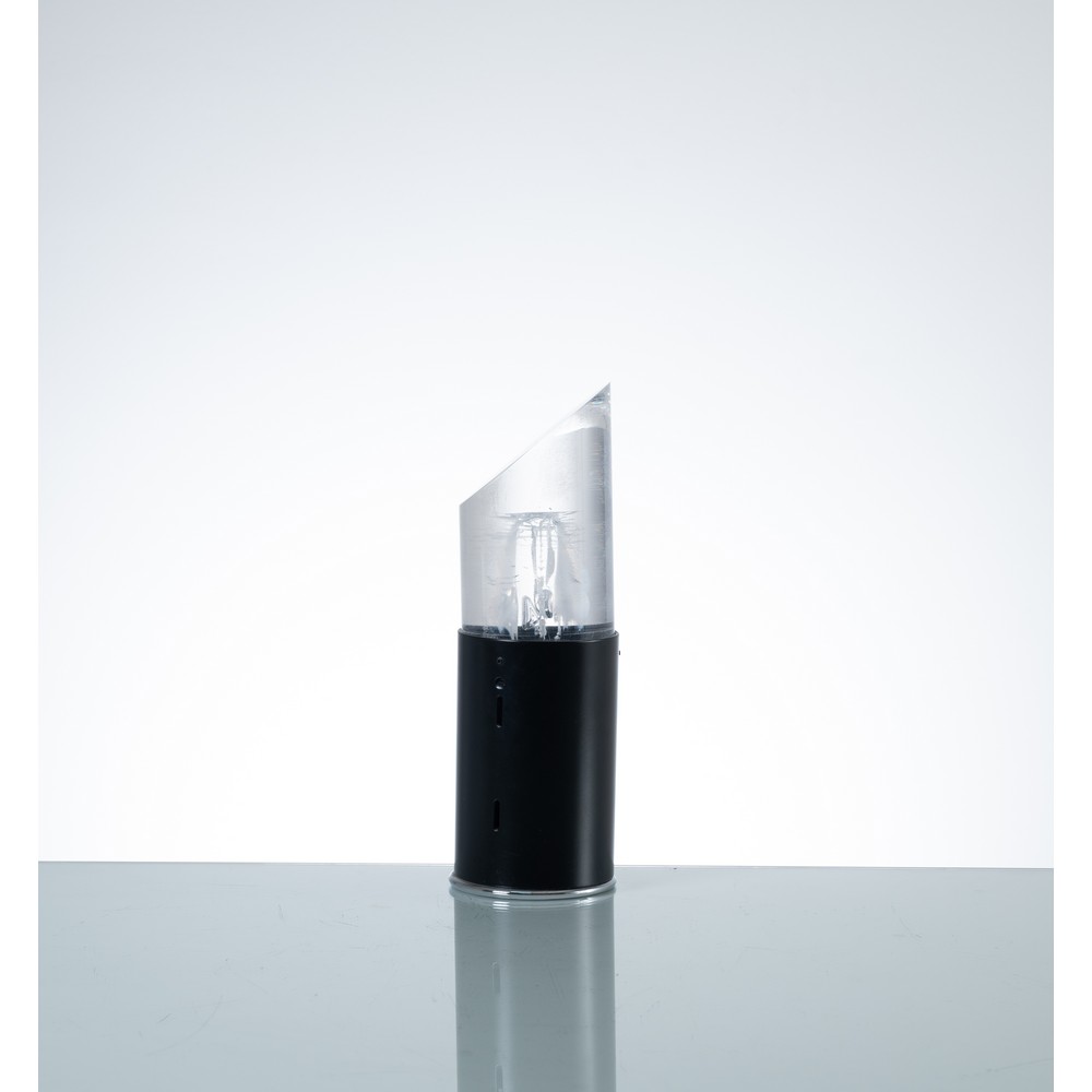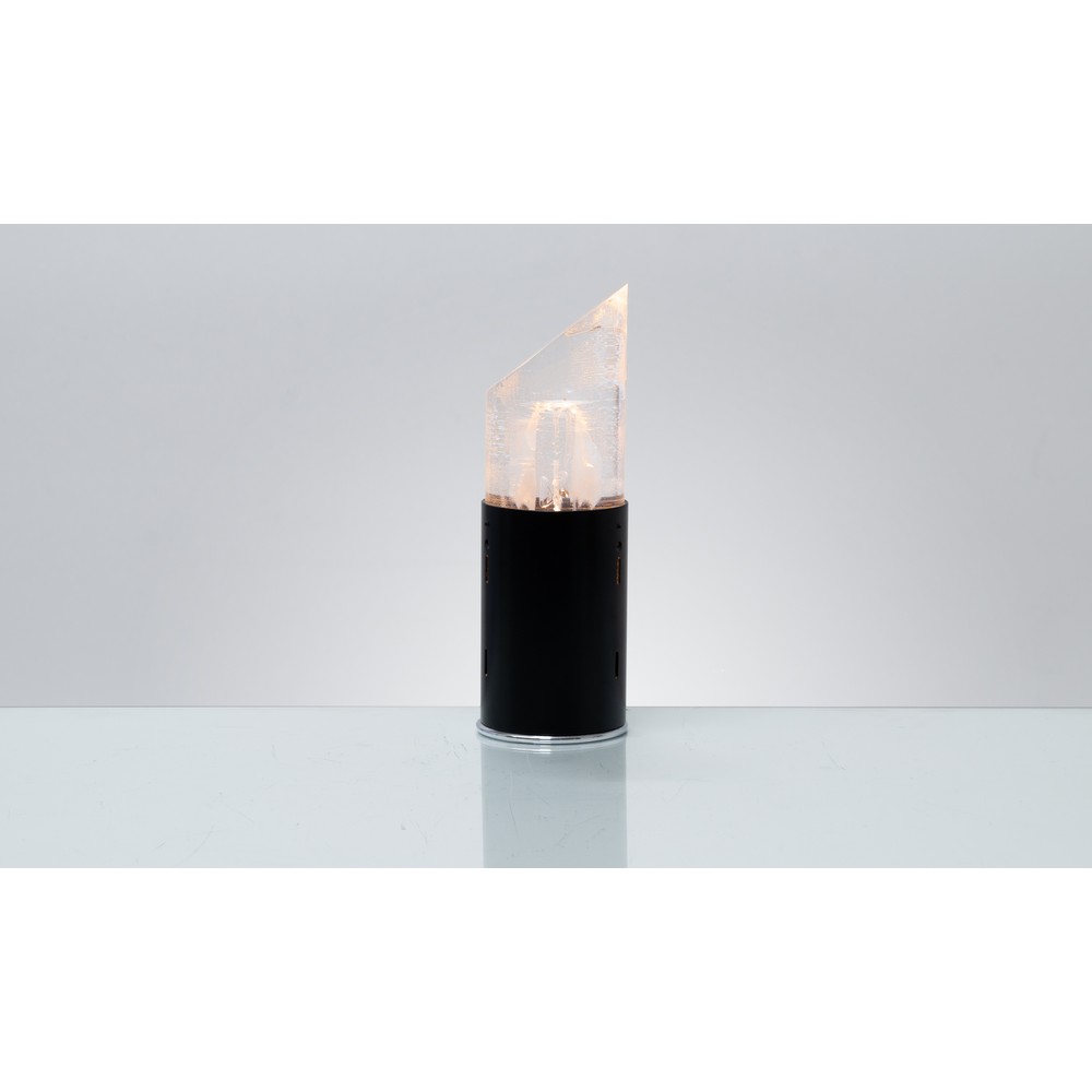 Lampada da tavolo ad una luce, corpo cilindrico con struttura in metallo verniciato nero, metallo cromato, diffusore in plexiglass incolore e ghiacciato, parte superiore inclinata.