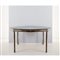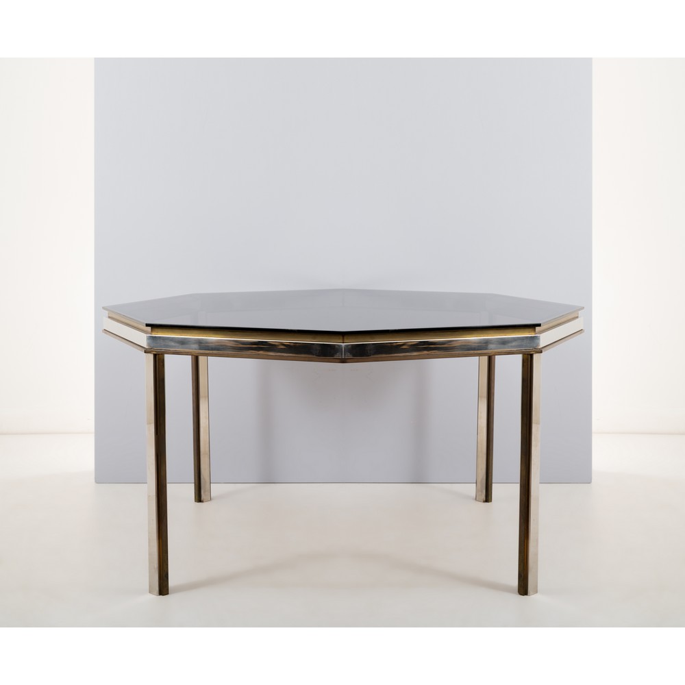 Tavolo in acciaio cromato e metallo dorato, piano ottagonale in vetro fumè.