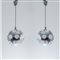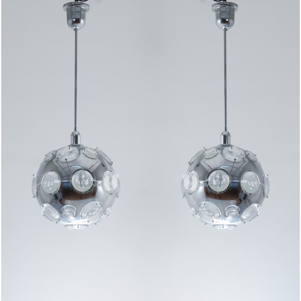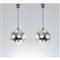 Coppia di lampade a sospensione ad una luce, struttura e diffusore sferico in metallo cromato con lenti di vetro.