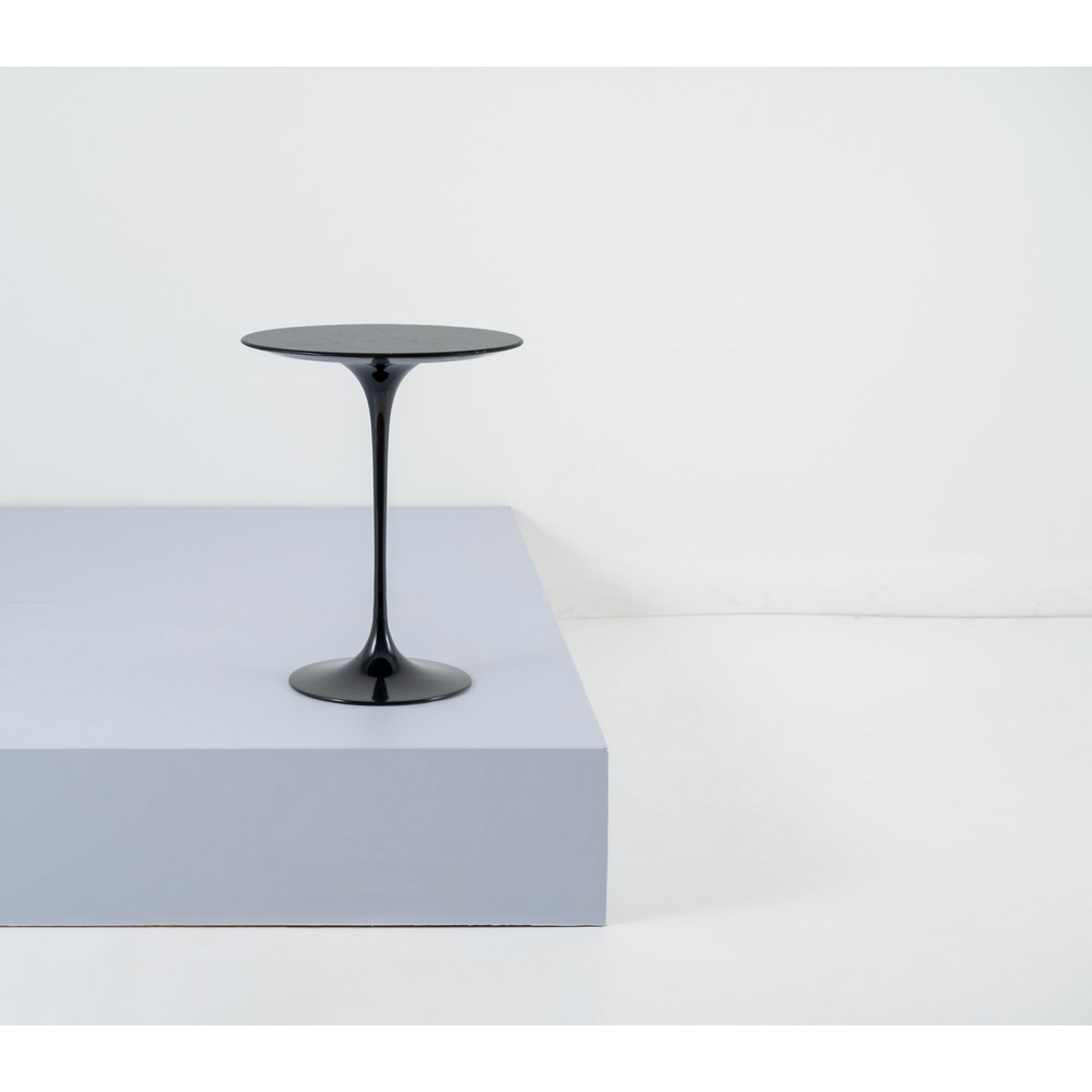 Tavolo basso modello “Tulip” disegnato nel (1956), base in fusione di alluminio verniciato nero e piano circolare in marmo nero Marquinia. Macchia sul piano.