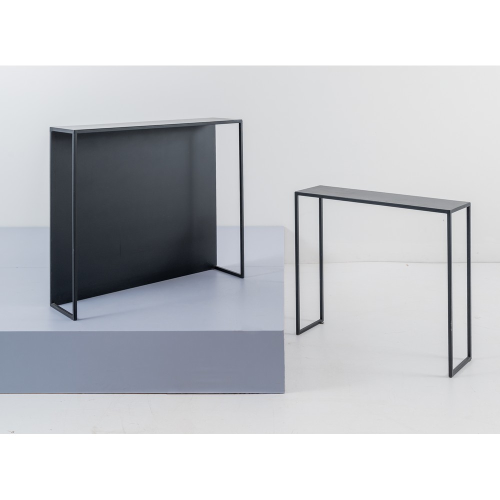 Due consolle impilabili con struttura e tamponatura in metallo verniciato nero. Graffi.