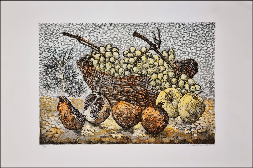 MOSCA MARIO Osimo (AN) 1940 "Natura morta" Acquatinta acquerellata a mano, cm 49x34 del 1981. Firmata sul fronte in basso a destra, tiratura 58/99 a sinistra. Certificato di autenticità a cura di Edizioni d'Arte Angolare.