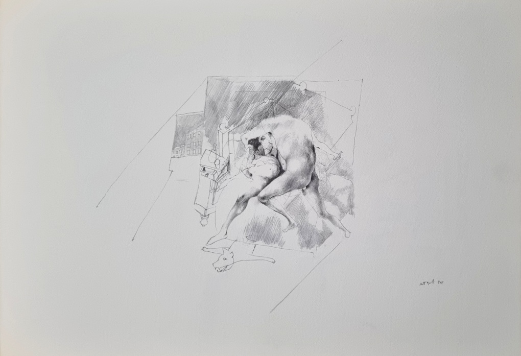 ATTARDI UGO Sori 1923 - Roma 2006 "E la stanza mi manteneva" Riproduzione litografica di opere eseguite dal Maestro, cm 49x34. Firmata e datata sul fronte in basso a destra.