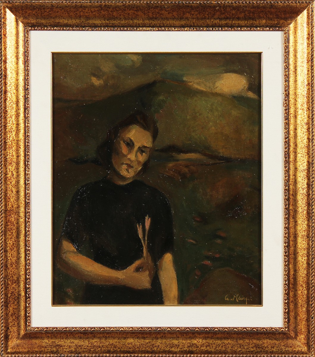 CARPI ALDO (1886 - 1973) Ritratto di donna con cipolla. Olio su tela . Cm 50,00 x 60,00. Firma in basso a destra. Cornice presente