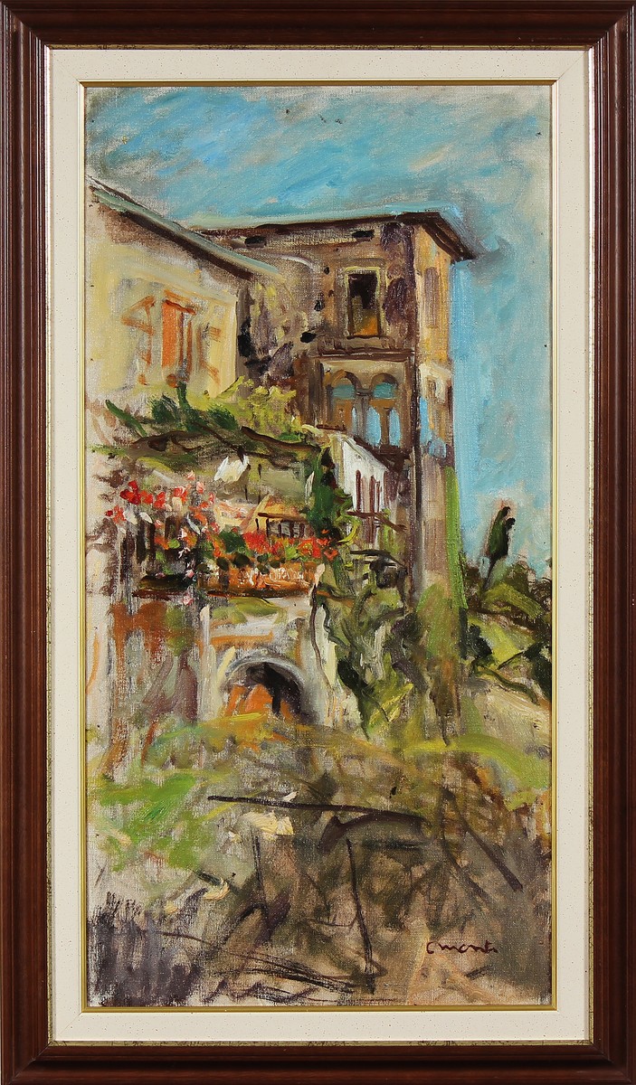 MONTI CESARE (1891 - 1959) Casa a Corenno. 1947. Olio su tela . Cm 78,00 x 39,00. Firma in basso a destra. In allegato all' opera lettera per autentica con dedica a firma di Angela Monti, nipote del pittore. Cornice presente