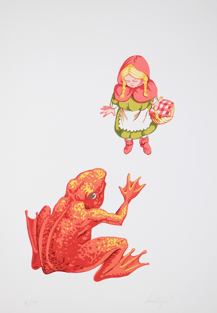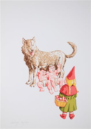 CUOGHI VANNI (n. 1966) Hai sbagliato fiaba e tutta un'altra storia. 1966. Serigrafia. Cm 50,00 x 35,00. Lotto composto da n. 2 serigrafie. Firma e tiratura 92/125 e 54/125 a matita in basso.