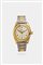 Cassa laminata con fondello a vite. Quadrante argento con indici geometrici e numeri arabi applicati. Bracciale in acciaio ed oro a molla integrato.