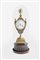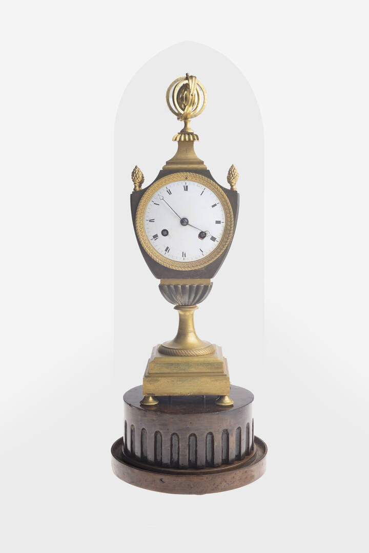 in bronzo dorato e patinato (difetti); Sommità a scudo con decoro superiore con astrolabio mobile; decori a pigna. Quadrante in smalto bianco con numeri serigrafati. Poggiante su base quadrata con piedini a cipolla.