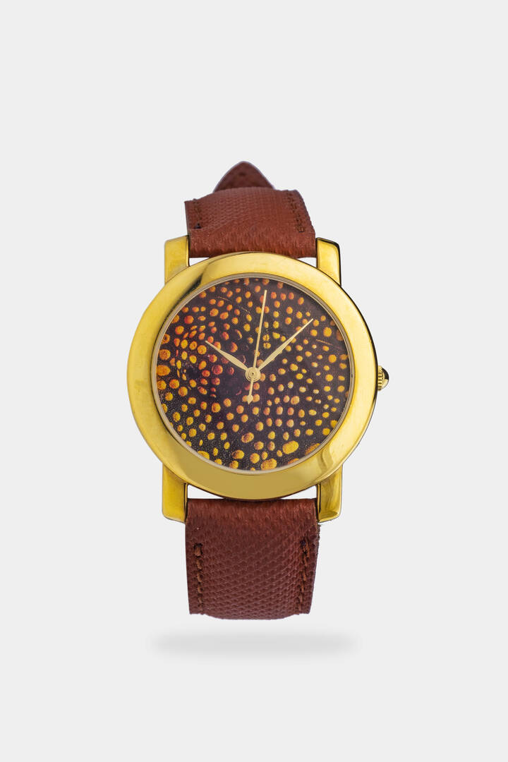 Cassa placcata con fondello a vite. Quadrante decorato con opera dell'artista Luigi Mainolfi.
