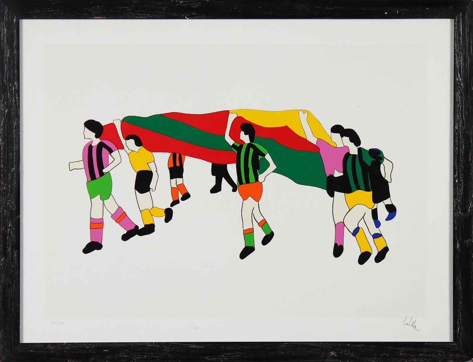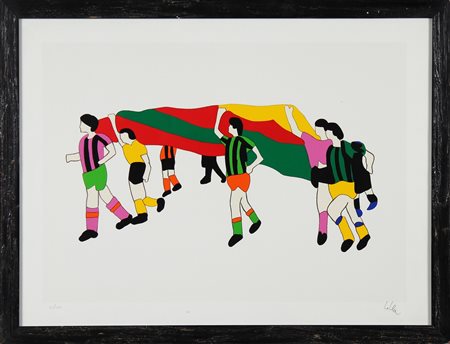 LODOLA MARCO (n. 1955) I calciatori. Litografia. Cm 80,00 x 60,00. 40/100. Tiratura a matita in basso a sinistra. Firma a matita in basso a destra. Cornice presente