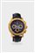 Cassa in oro rosa curva di grandi dimensioni. Quadrante nero tapisserie con indici geometrici applicati, indicazione dei secondi continui al 3, dei 30 minuti cronografici al 9, delle 12 ore al 6 e datario al 5.
