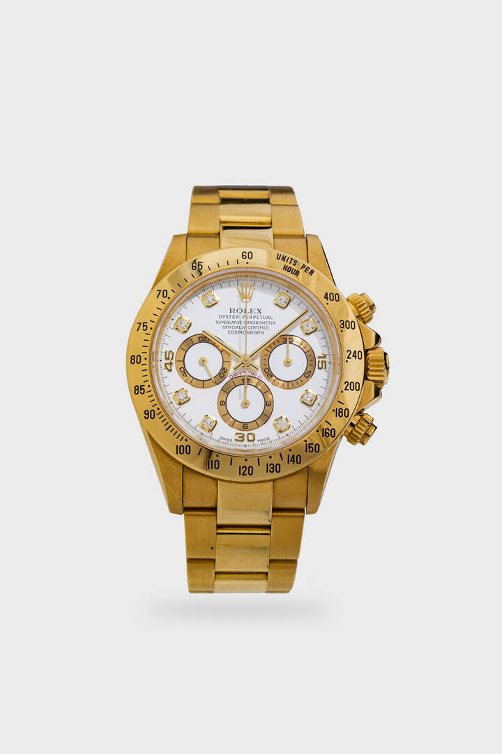 Cassa in oro con fondello a vite e pulsanti della cronografia a vite. Lunetta tachimetrica base 400. Quadrante bianco con diamanti di fabbrica. Ad ore 3 si trova il contatore dei minuti, alle 6 quello delle ore ed alle 9 quello dei secondi continui. Bracciale originale Rolex in oro “Oyster” con chiusura clasp.