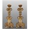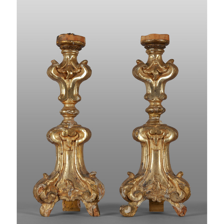 Coppia di candelieri Luigi XIV in legno intagliato e dorato a mecca montati a tavolino con piano in marmo