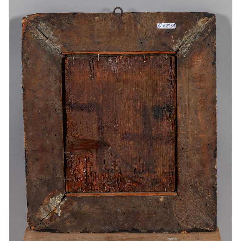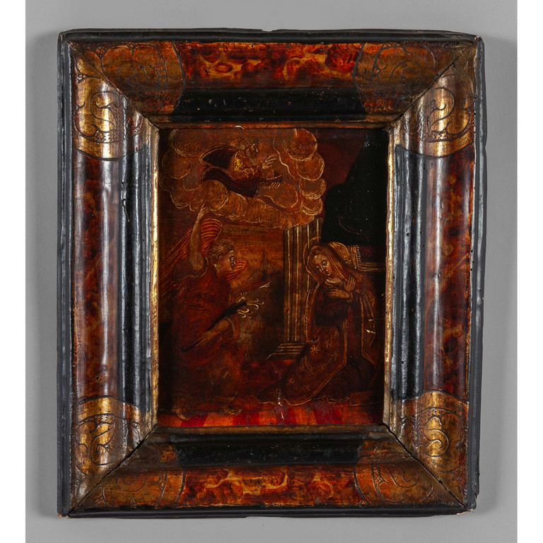 Scuola dalmata sec.XVII 'Annunciazione' olio su tavola cornice coeva in legno laccato intagliato e dorato