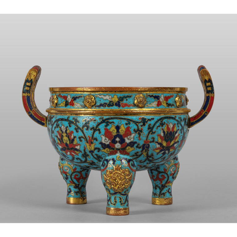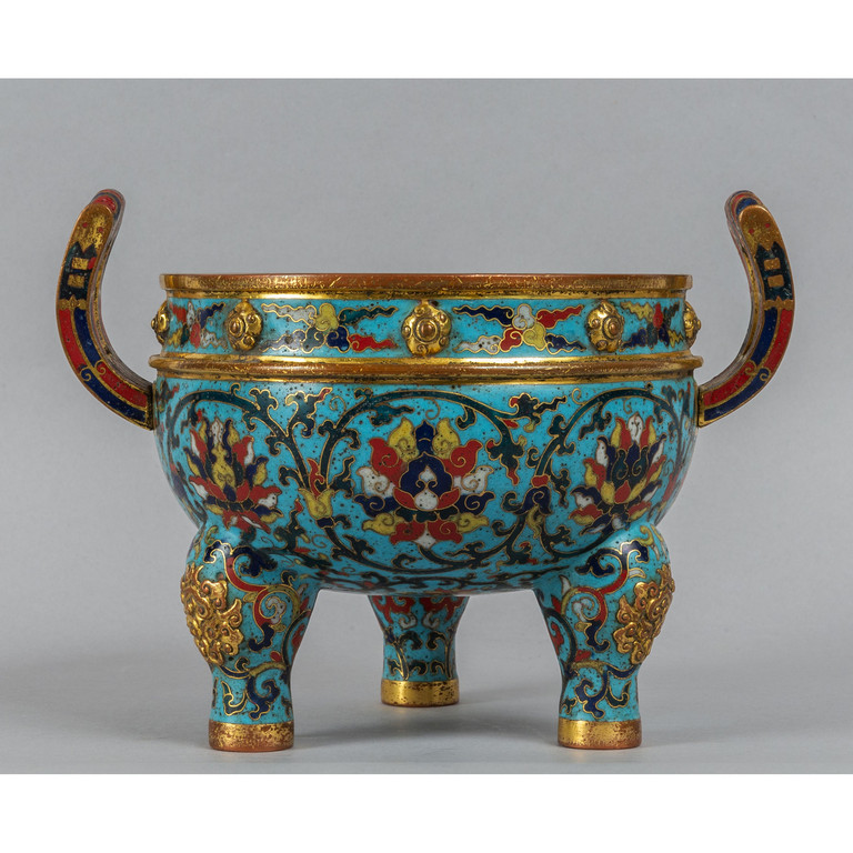 Incensiere a tre piedi in bronzo cloisonnè decorato con motivi di fiori di loto Cina