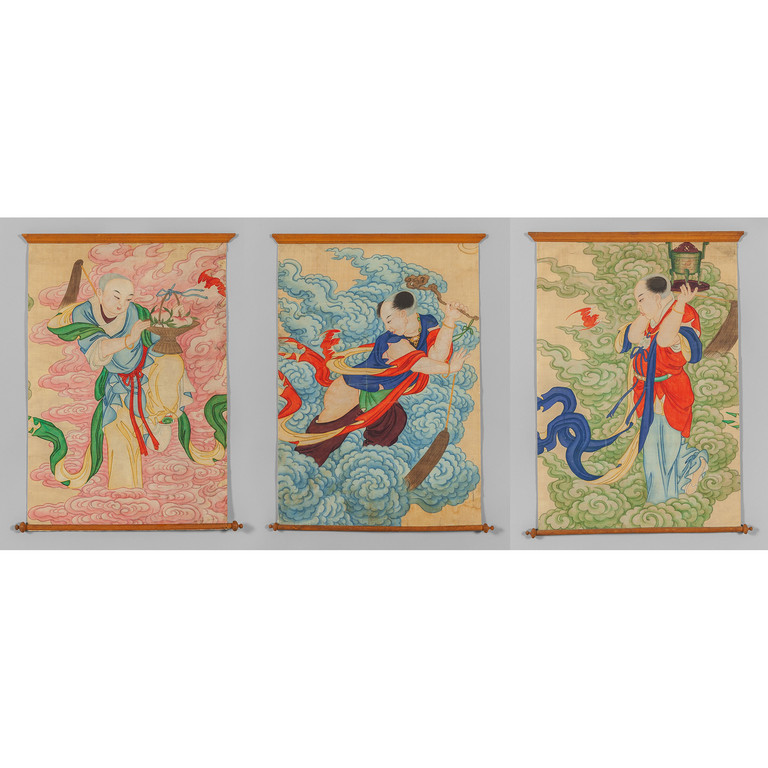'Figure orientali' tre pannelli dipinti su seta Cina