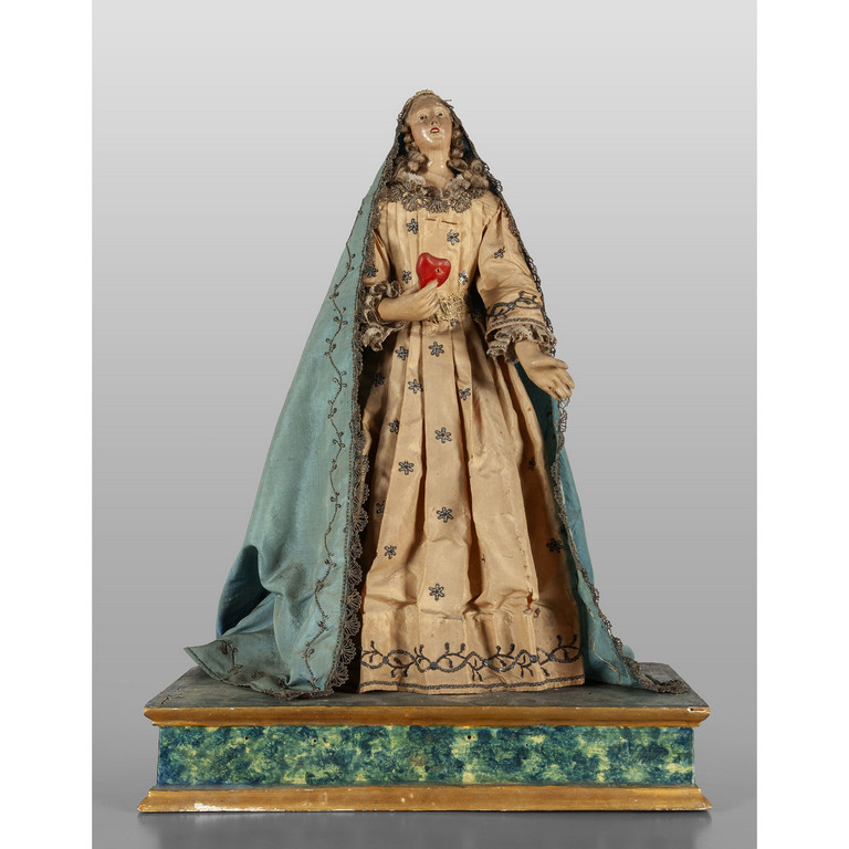 Madonna scultura in cartapesta con abiti in stoffa poggiante su base coeva in legno intagliato laccato e dorato sec. XVIII
