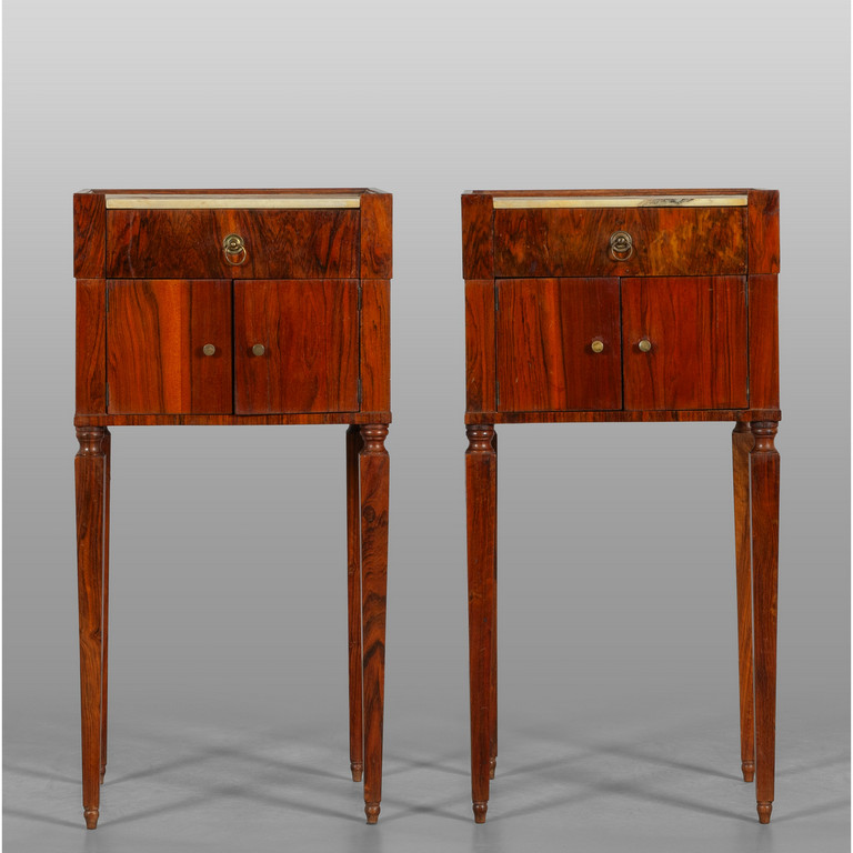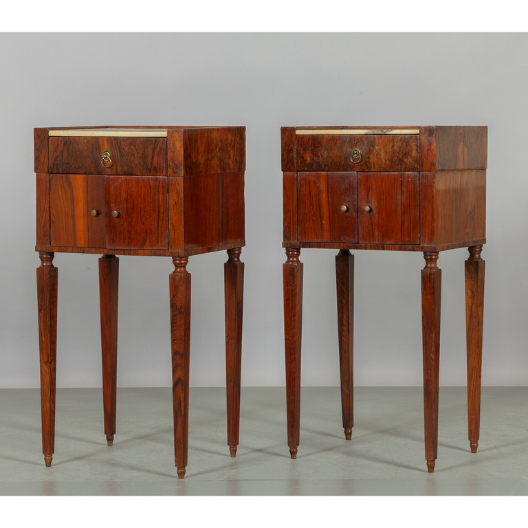 Coppia di comodini Direttorio lastronati in palissandro due sportelli più cassetto piano in marmo Genova inizi sec.XIX