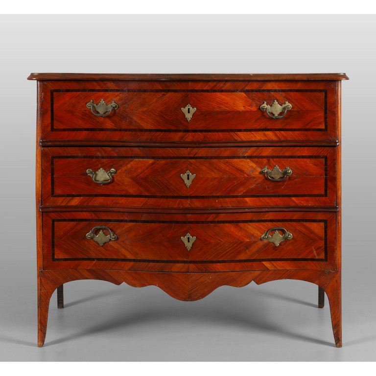 Comò Luigi XIV a tre cassetti lastronato in palissandro e filettato sec.XVIII