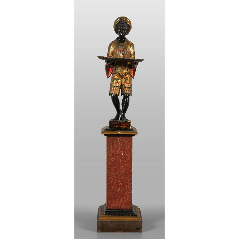 Moretto portavassoio in legno finemente intagliato laccato e dorato poggiante su colonna in legno laccato a finto porfido Venezia sec.XIX