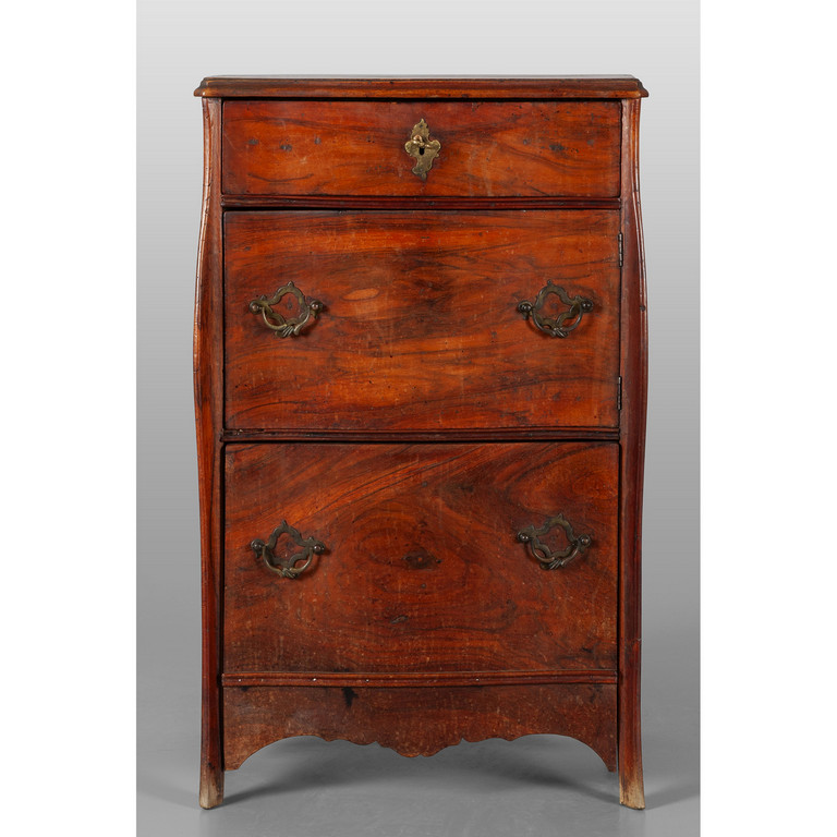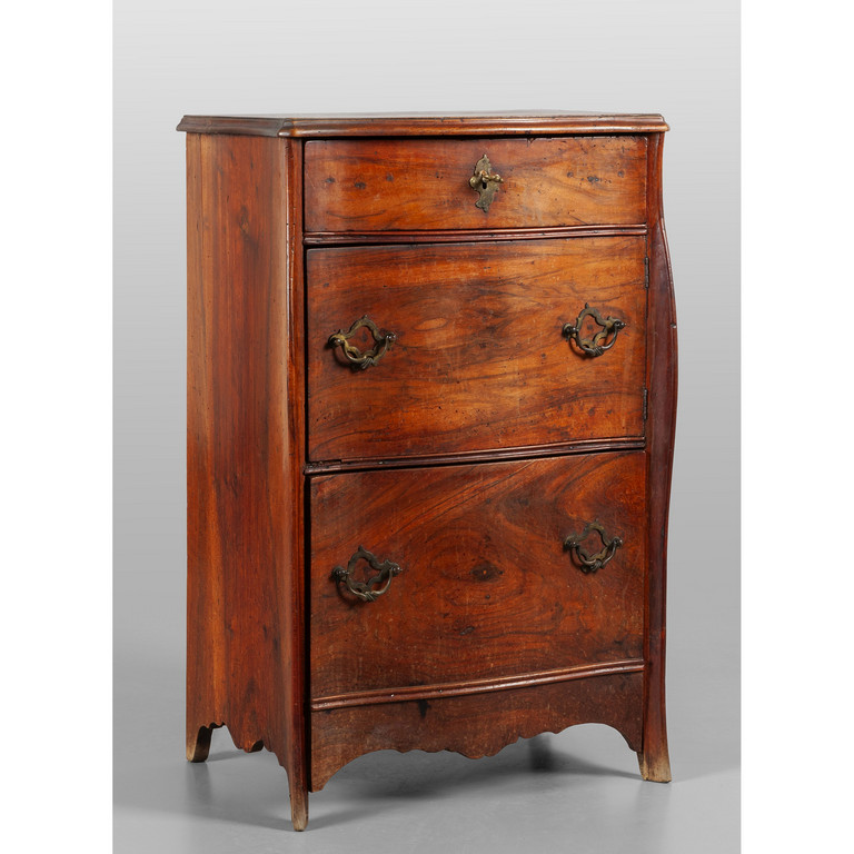 Piccolo comò in massello di noce due cassetti ed uno sportello centrale movimentato sul fronte Genova I metà sec.XVIII
