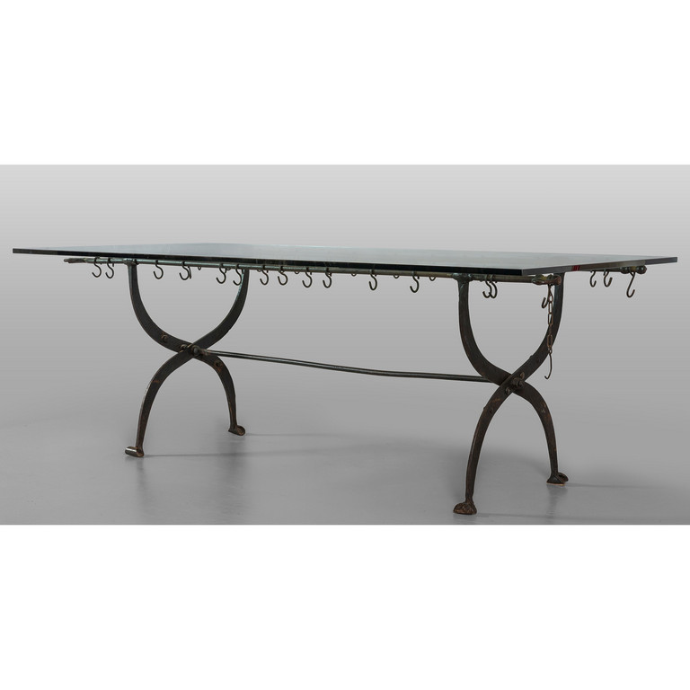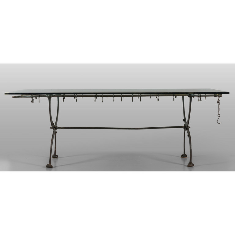 Tavolo composto da antico letto da campo piano in vetro inizi sec.XIX