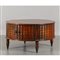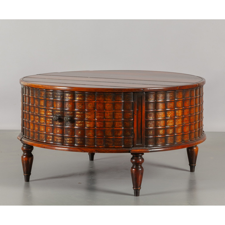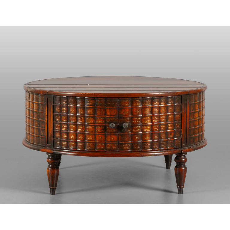 Mobile basso rotondo in mogano nella fascia trompe l'oeil di finti libri sec.XX