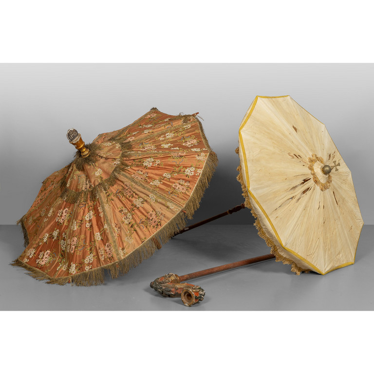 Due antichi ombrelli da processione di cui uno ricamato a motivi floreali