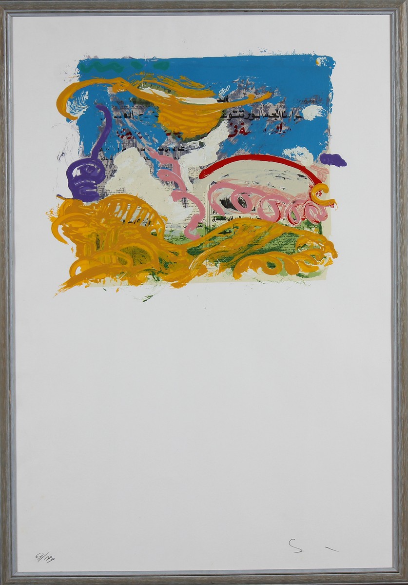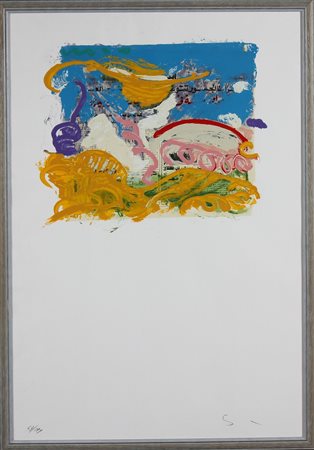 SCHIFANO MARIO (1934 - 1998) Senza titolo. Serigrafia ritoccata a mano. Cm 66,00 x 97,00. 63/199. Tiratura a matita in basso a sinistra. Firma a matita in basso a destra. Cornice presente