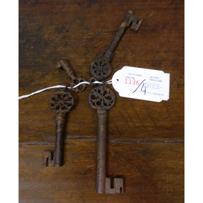 Previous Lot 1136 Next Aste Boetto - Via Mura dello Zerbino 10R, 16122 Genova ASTA DI ARTE ORIENTALE e ANTIQUARIATO Asta di Arte Orientale e Antiquariato Wednesday 19 June 2024 hours 10:30 (UTC +01:00) OGGETTISTICA Quattro chiavi antiche di varie forme e misure