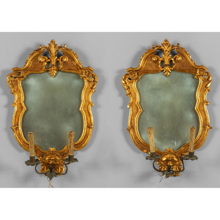 Coppia di specchierine in stile Luigi XVI in legno intagliato e dorato con braccetti