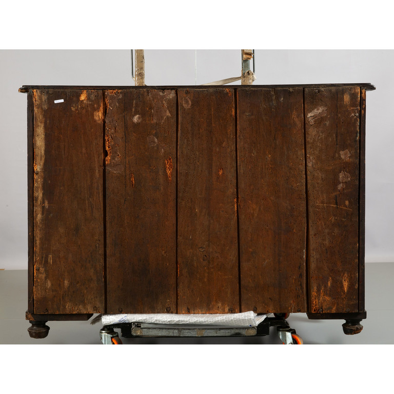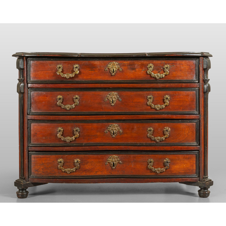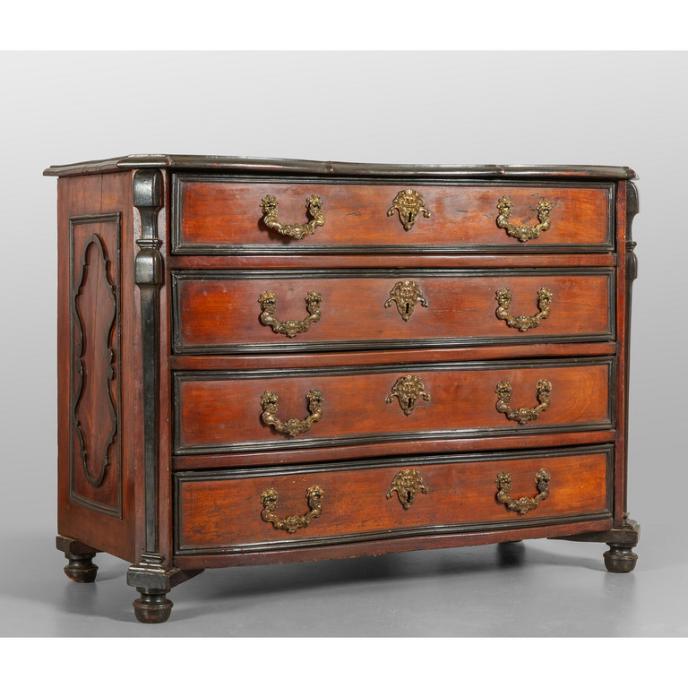 Comò Luigi XIV in noce a quattro cassetti movimentato sul fronte montanti scantonati fianchi con cornicette nere Lombardia I metà sec.XVIII