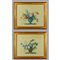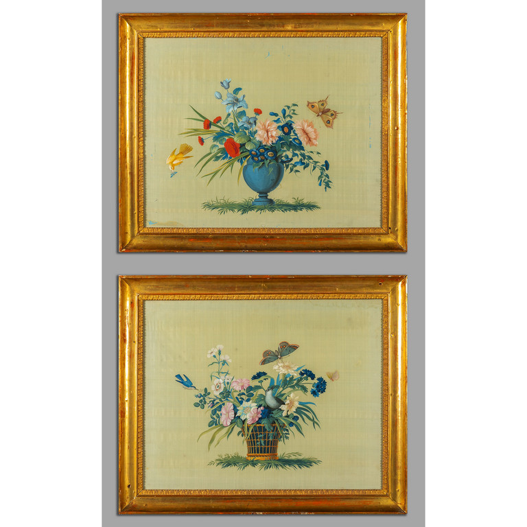'Vasi di fiori con uccellini e farfalle' coppia di tempere su seta I metà sec.XIX cornici coeve in legno intagliato e dorato