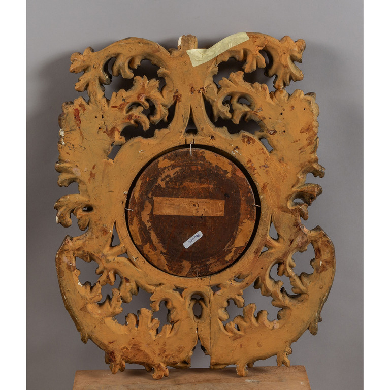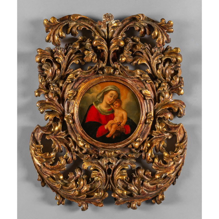 Scuola bolognese sec.XVIII 'Madonna con Bambino' olio su tavoletta di forma rotonda cornice in legno intagliato e dorato (mancanze)