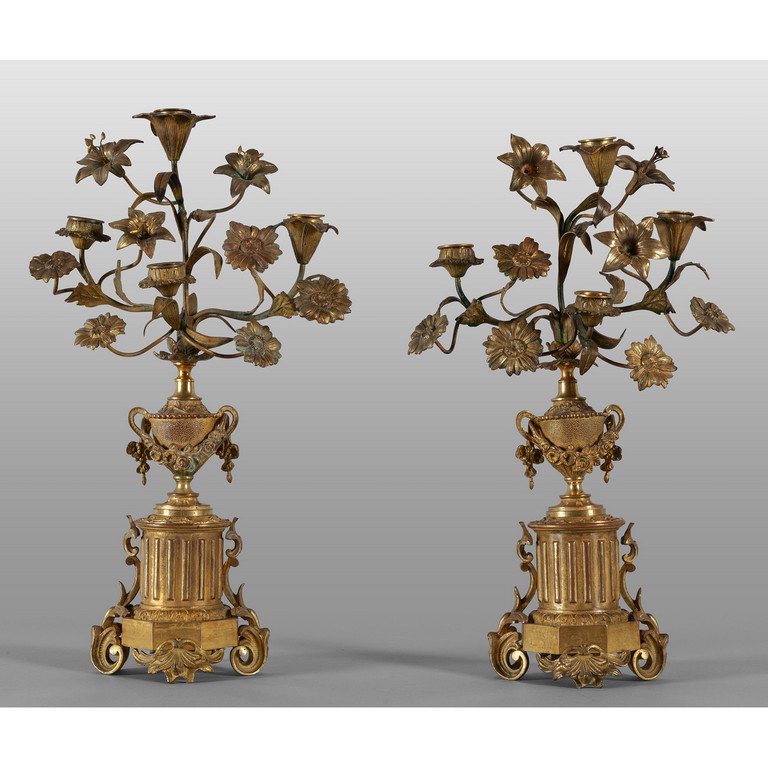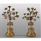 Coppia di candelieri a quattro bracci in metallo dorato raffiguranti vasi di fiori su colonne