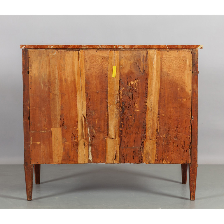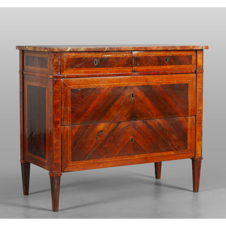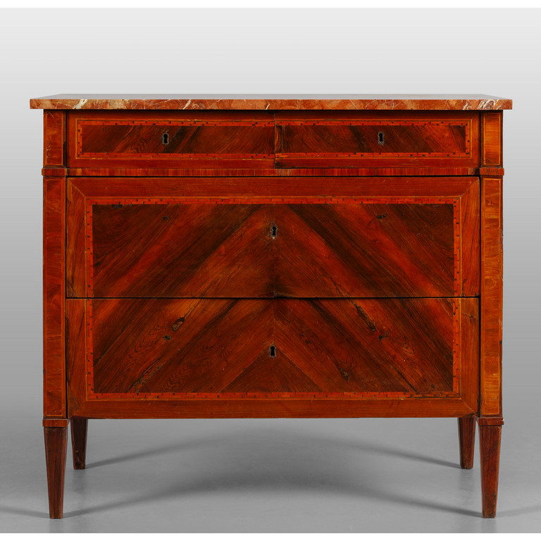 Piccolo comò Luigi XVI lastronato in palissandro e filettato in bois de rose due cassetti grandi e due piccoli piano in breccia rossa Genova II metà sec.XVIII